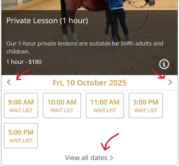 The ‘View all dates’ button shows more details, including coach info and extra availability. You can also use the arrows beside the date to flick through to the next or previous day to find what suits you best.